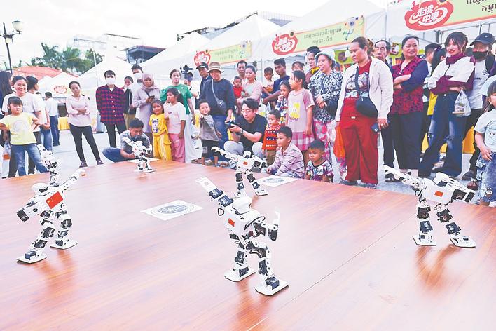 12月14日,在柬埔寨金边,人们在“走读中柬”系列文化活动文化市集上观看机器人表演。 由五洲传播出版传媒有限公司主办的“走读中柬”系列文化活动文化市集13日至14日在柬埔寨首都金边举行。为期两天的活动吸引大量当地民众与各国游客参与。 新华社发(萨雷摄)