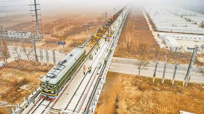 本报讯(记者周亚彬 通讯员侯晓静 董策)12月19日上午,在京港高铁雄商段邢台清河县铺轨施工现场,最后一对500米长钢轨的铺设就位,标志着该段正线铺轨完成,这为线路按期开通运营奠定了坚实基础。
