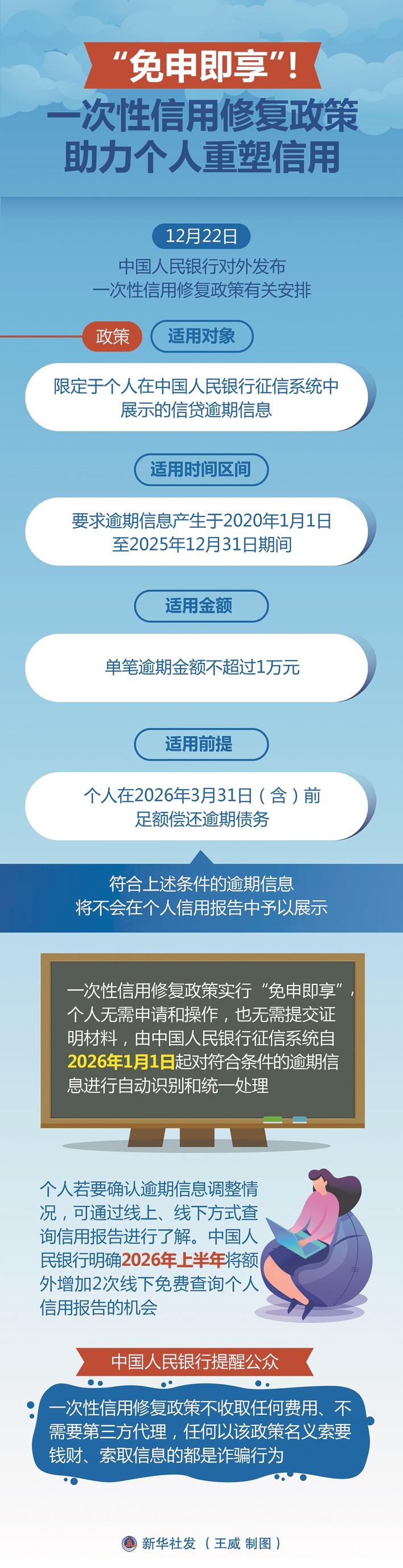 在进行必要的技术准备后,中国人民银行于22日明确发布一次性信用修复政策有关安排。自2026年1月1日起征信中心将根据不同还款情形完成自动调整,相关逾期记录不再在个人信用报告中展示。