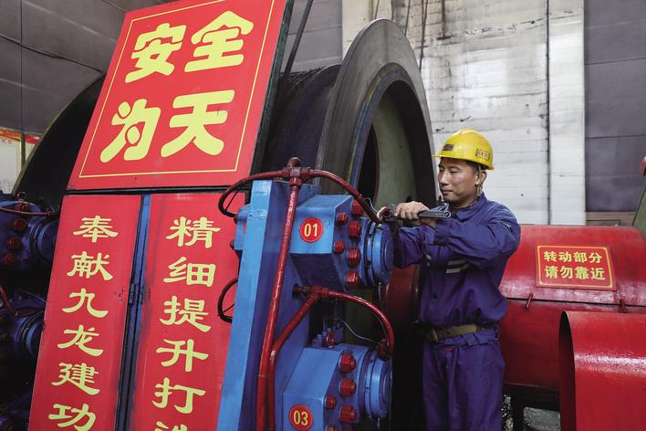 峰峰集团九龙矿持续加大设备检修维护力度,严格落实“点检定修制”和日周月检制,扎实开展设备动态巡检,实行设备包保,全方位排查处理安全隐患,确保设备完好率和安全可靠运行。图为该矿职工在主井车房内调试绞车盘形闸间隙以及传感器距离。杜鹏龙 摄