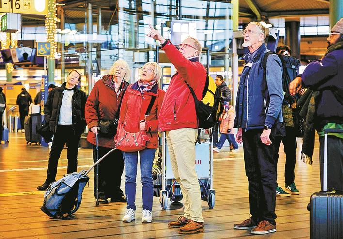 1月4日,在荷兰阿姆斯特丹史基浦机场,数百架次航班被取消后,旅客查看航班信息。 受寒潮带来的强降雪影响,近日欧洲多地的空中、地面和轨道交通严重受阻。荷兰阿姆斯特丹史基浦机场大量航班取消,阿姆斯特丹周边列车停运。巴黎地区的两大机场起降航班缩减,地面多条公交线路停运。新华社/法新