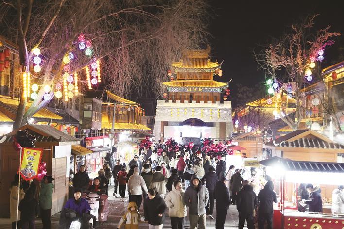 近日,故城县“烟火暖街,新岁启封”活动在大运河历史文化街区二道街精彩上演。来自四面八方的游客与本地居民循着烟火气齐聚古街。图为群众在夜色中观光游览。 齐红雨 摄