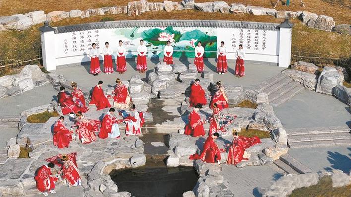 距百泉鸳水公园十几公里处,有两个村庄——周公村和桃花村,这里是周公和桃花女传说的发生地。“传说逐渐演变为中国北方婚俗的核心礼仪,今天我们熟悉的‘射桑木箭’‘跨马鞍’‘撒谷豆’‘跨火盆’等婚俗,皆源于此。”邢台市婚礼庆典礼仪文化协会常务副会长武继超介绍。