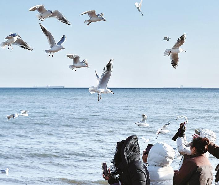 1月6日,海港区金梦海湾片区海滩上,成群海鸥翩然而至。它们或踱步滩头啄食觅食,或振翅凌空嬉戏盘旋,灵动的身影为冬日海岸勾勒出一道靓丽风景线。图为市民在观赏海鸥觅食。曹建雄 摄