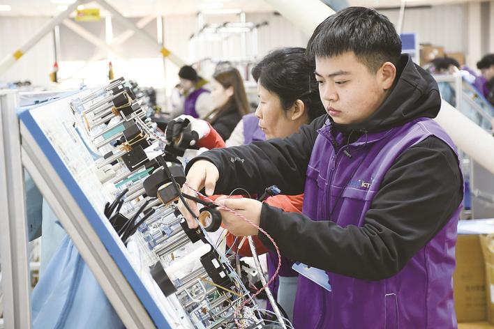 近日,永年工业园区的企业纷纷开足马力忙生产,加紧赶制订单,力争实现新年“开门红”。图为1月5日,在永年工业园区的邯郸永旭汽车电子有限公司,工人在汽车线束生产线上加紧赶制订单产品。通讯员 胡高雷 摄