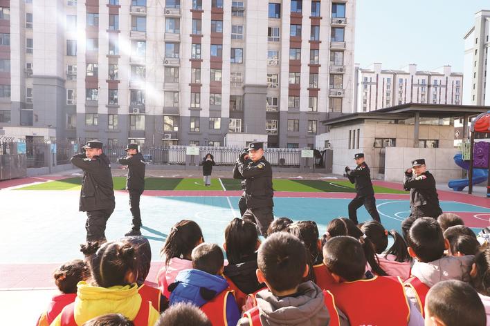 日前,冀州区公安局治安大队联合特巡警大队走进冀州区第三幼儿园开展警营开放日主题活动,让萌娃们沉浸式感受警营魅力。图为冀州区公安局特巡警队员表演擒敌拳。王月涵 摄