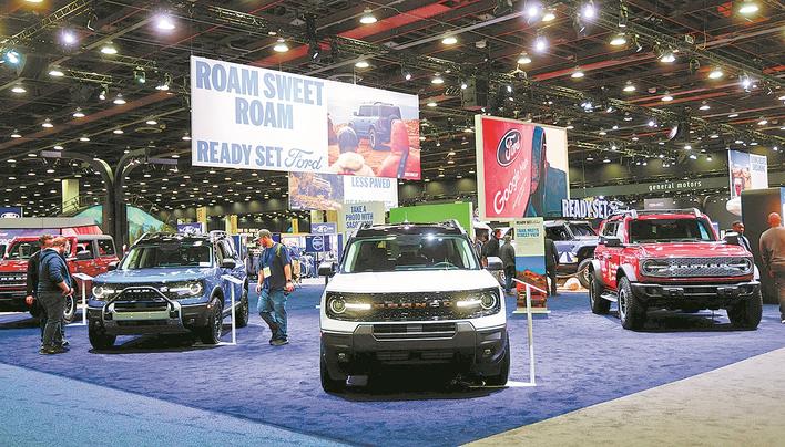 这是1月14日在美国底特律车展的媒体开放日现场拍摄的福特展台。美国底特律车展于1月14日至25日在“汽车之城”底特律举行。新华社/路透