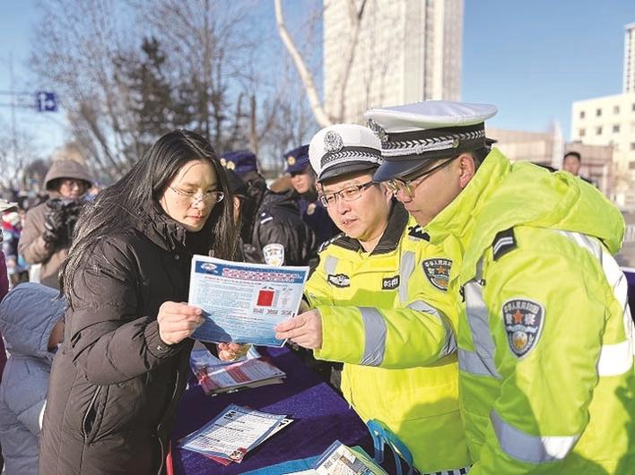 1月10日,秦皇岛市公安局围绕“四十载守护平安,110勇毅前行”主题,开展了一系列丰富多彩、富有实效的集中宣传活动。图为活动现场,民警为群众发放宣传资料。记者 祖迪 摄