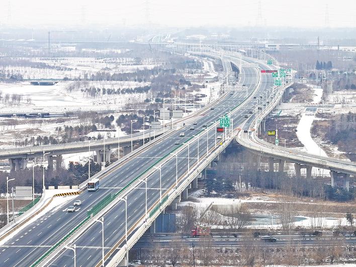 这是1月18日拍摄的京雄高速雄安新区启动区连接线(无人机照片)。记者从河北省交通运输厅获悉,“十四五”时期,河北省高速公路总里程突破9000公里,与京津高速公路接口达30个,雄安新区“四纵三横”对外高速公路网进一步加密,雄安新区与京津实现高速公路直连直通,京雄两地1小时通达,京津冀交通一体化全面提速。新华社记者 朱旭东 摄