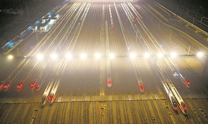 1月25日拍摄的停靠在江苏省南京市南京南动车运用所的动车组列车(无人机照片)。1月26日零时起,全国铁路将实行新的列车运行图。新华社发(杨素平摄)