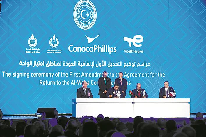 1月24日,在利比亚首都的黎波里,利比亚与法国道达尔能源公司和美国康菲石油公司举行协议签字仪式。 利比亚民族统一政府总理德拜巴1月24日宣布,利比亚与法国道达尔能源公司和美国康菲石油公司签署一项为期25年的石油开发协议,投资总额超过200亿美元。德拜巴是在出席第四届利比亚能源与经济峰会期间宣布了这一消息。 新华社发(哈泽姆·图尔基亚摄)