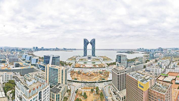 1月29日拍摄的位于滴水湖畔的临港西岛中银金融中心双子塔楼(无人机全景照片)。