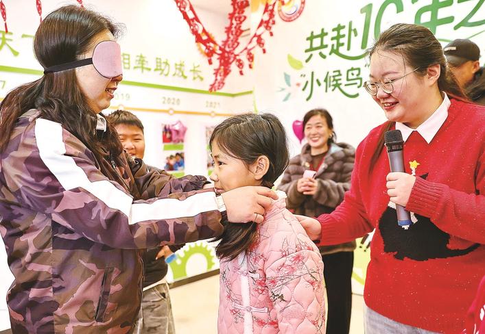 1月29日,由海港区河东街道团工委、河东街道工人南里第二社区共同举办的“共赴十年之约 小候鸟新春暖心派对”主题活动举行。该活动通过趣味游戏等方式,让平日里的留守儿童感受到家长的陪伴。图为孩子和家长共同参与“亲子默契挑战”游戏。曹建雄 摄