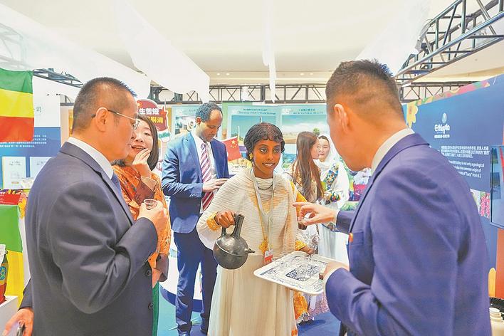 2月4日,在“共享大市场·出口中国”2026年首场活动暨北京国际精品荟的进口商品推介区,参观者在品尝展出的埃塞俄比亚咖啡。