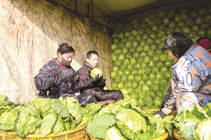 隆冬时节,滦南县胡各庄镇井离庄村的大棚卷心菜长势喜人。工人们忙着采收、分拣、装筐、搬运,新鲜卷心菜被快速装载上车。这条冬季“绿色通道”,保障滦南优质蔬菜顺利供应京津市场,端上百姓餐桌。近年来,胡各庄镇加快农业产业化发展步伐,以土地规模化经营筑牢提质增效根基,大力发展反季果蔬种植。目前,该镇小葱、卷心菜、辣椒等果蔬年产量达1.65万吨,年实现蔬菜产业收入9000万元,反季蔬菜已成为当地农民增收致富的支柱产业。图为工人们在加工卷心菜。