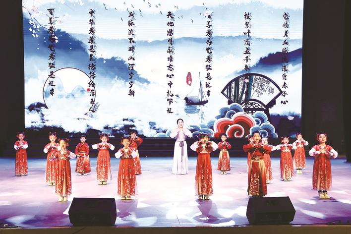 近日,香河县举办“书香伴诗行,雅韵绘香河”中华诗词文化展演。活动以“诗词+”为核心,连接多元表现载体,精心组织了10余个节目,为观众献上了一场诗词盛宴。图为活动现场。张怡然 摄