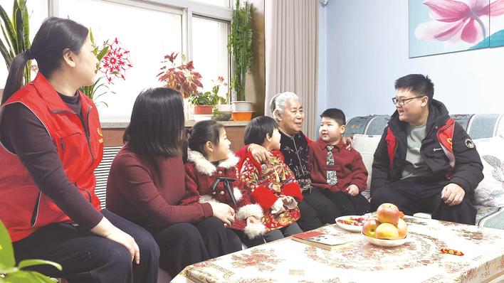 近日,武邑县委社会工作部联合迎宾社区、武邑县第一幼儿园共同开展“巧手剪纸迎新春、童心敬老送温暖”志愿服务活动,组织孩子们走进辖区老党员家中送上节日祝福。图为志愿者陪老人聊天。 通讯员 许宁 摄