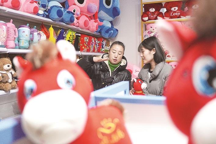随着农历马年临近,内丘县一家玩具科技公司内一片繁忙景象。工人们正加紧裁剪、缝制、填充、包装一批批“马年主题”毛绒玩具,以满足节前市场需求。图为该公司员工向顾客介绍“马年主题”毛绒玩具。通讯员 韩文洲 苏丹丹 摄