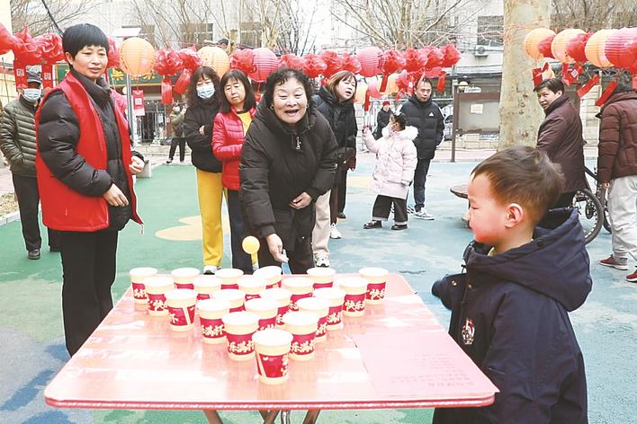 2月27日,高碑店市兴华路街道中铁社区与嘉园社区联合举办“我们的节日·元宵节——马跃元宵·邻里同乐”元宵喜乐游园会。图为社区居民参与趣味投球游戏,在欢声笑语中感受传统节日的欢乐氛围。安桐萱 马凯 摄