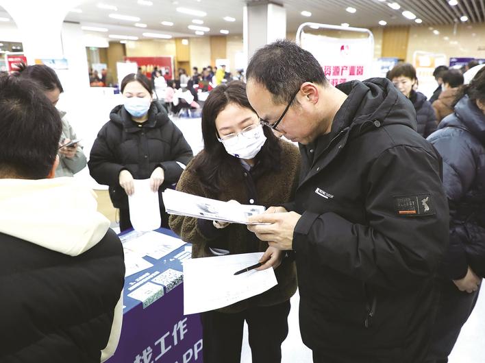 近日,固安县举办2026年“春风行动”暨就业援助季首场专场招聘会,共有89家企业参与,提供约2120个岗位,旨在为企业复工复产纾困解难,为返乡务工人员搭建家门口就业的桥梁。图为在固安县市民服务中心,求职者询问招聘人员岗位信息。张琛 摄
