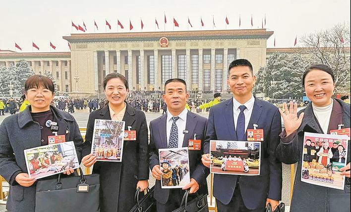 3月5日,十四届全国人大四次会议开幕会前,来自河北、江苏、重庆、甘肃代表团的5位全国人大代表相约在人民大会堂前合影。