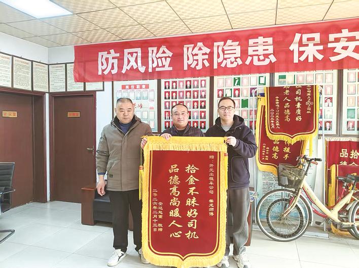 近日,辛集市开元出租车公司驾驶员柴龙捡到遗失快递包裹后,妥善保管并及时报备、多方联系找到失主,获赠锦旗。市交通运输综合执法大队号召全体驾驶员向其学习,争做城市文明使者。孟润芝 摄