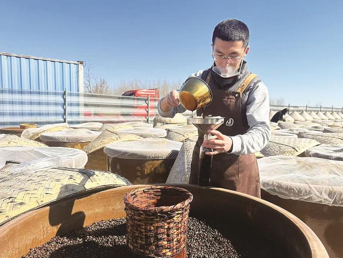 近日,在秦皇岛市抚宁区抚宁镇亿厨酱园,孟氏古法酱油酿造第四代传承人孟阳开始探索小规模标准化生产路径,这样做既保障了每一批次酱油风味的稳定性,又筑牢了食品安全防线。图为孟阳为酱缸内的黄豆进行浇淋。通讯员 张晓磊 摄