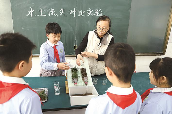 近日,沧州市实验小学精心策划了一场“沉浸式绿色体验之旅”,通过“听、探、寻、换、植”五个维度,引导同学们在亲身体验中感受守护绿水青山的时代责任。图为学校开展的水土流失对比实验。 吕春龙 赵欣悦 摄