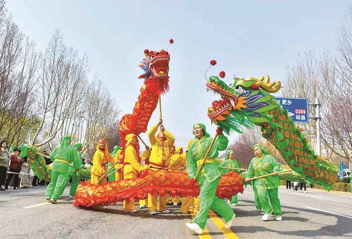 3月20日,广平县一场民俗文化盛宴在该县新发地南大门拉开了帷幕。踩高跷、舞龙、舞狮等十余支表演队伍齐聚一堂,用最地道的民俗表演为城乡居民呈献了一道文化盛宴。图为舞狮表演。通讯员 杨海斌 摄