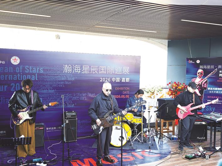 近日,由从北京宋庄落户河北燕郊的50余名艺术家及文艺爱好者共同筹办的“瀚海星辰”主题画展,在三河市燕顺路街道嘉都艺术中心开幕。图为在画展上,专业乐队带来摇滚电声表演。杨晓琦 张益杰 摄