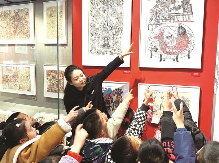 3月20日,为传承中华优秀传统文化,让孩子们近距离感受非遗年画与传统节日的魅力,河北省武强年画博物馆联合武强县第一幼儿园开展“龙抬头·品年画·传民俗”主题研学活动。图为讲解员在给孩子们介绍武强年画。 武强年画博物馆 供图