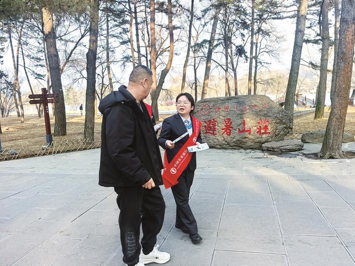 近期,农行承德分行紧扣“清朗金融网络 守护安心消费”主题,常态化开展金融知识进景区、进社区、进校园、进乡村活动,满足群众多元化需求,以更优质、更贴心的金融服务,营造安全、清朗、放心的金融消费环境,全力守护群众财产安全。图为该行员工走进避暑山庄开展金融知识宣传。杨柳 摄