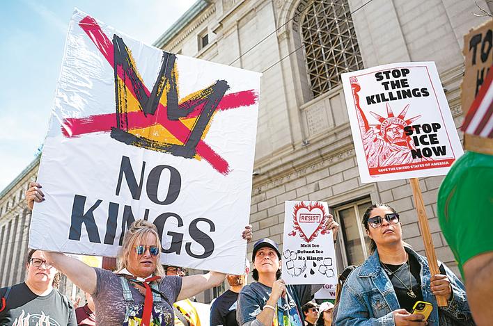 3月28日,人们在美国加利福尼亚州旧金山参加“不要国王”抗议活动。 美国多地3月28日爆发示威抗议活动。数百万民众走上街头,针对特朗普政府的移民执法等一系列政策表达不满,呼吁结束对伊朗的军事打击。此次抗议活动以“不要国王”为主题。组织方预计,当天全美共举办超过3100场抗议活动,覆盖50个州,以及华盛顿、纽约、洛杉矶等主要城市。新华社发(朱子于摄)