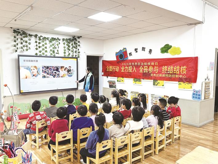 近日,保定市竞秀区疾病预防控制中心启动为期一个月的结核病防治主题宣传系列活动。图为工作人员在幼儿园向孩子们科普结核病防治知识。吴伟 摄
