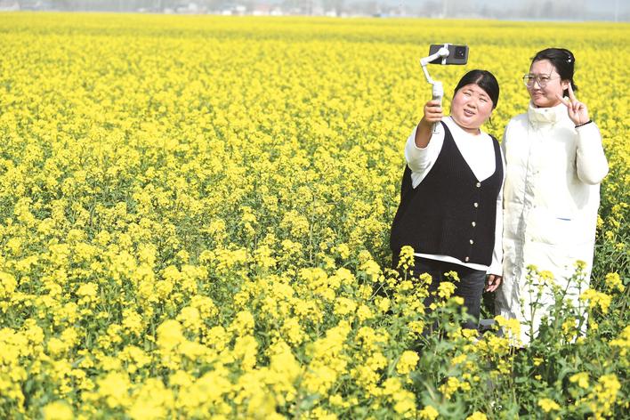 近日,广平县广平镇西韩村千亩油菜花迎来盛花期,当地文旅部门抢抓花期机遇,联合气象局开展“气象+文旅”活动,吸引市民游客前来赏花。图为游客在花海中拍照打卡。程学虎 摄