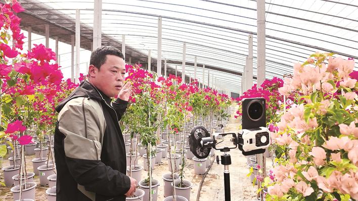 近日,在大名县束馆镇的一座大棚内,绚丽多彩的花卉竞相绽放。图为种植户刘志明在通过手机直播售卖棚内种植的花卉。 冯利轩 摄