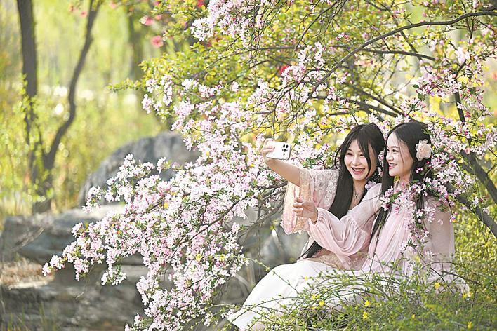 3月31日,游客在石家庄市植物园拍照游玩。春风拂面,繁花盛开。人们踏春赏景,漫步在花海之中,感受春日生机与美好。新华社发(陈其保摄)