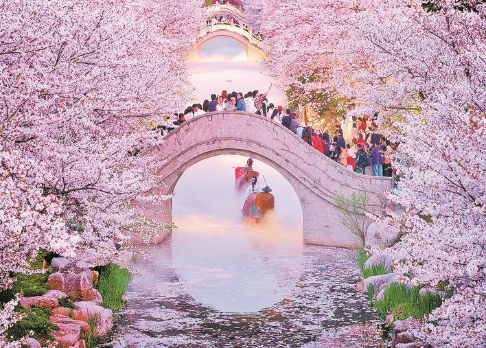 4月5日,游客在江苏南通洲际梦幻岛欣赏樱花河(无人机照片)。 清明假期,人们度假休闲,踏青游玩,释放“春日经济”新活力。 新华社发(许丛军 摄)