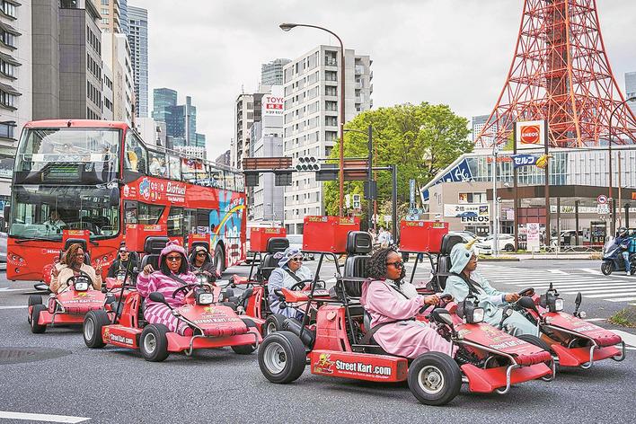 4月6日,外国游客驾驶卡丁车经过日本东京街头一处加油站。 日本媒体5日报道,受中东局势影响,日本原油进口量骤降,引发广泛担忧。日本政府正考虑于5月追加释放国家石油储备,释放量相当于日本约20天的用量。新华社/法新