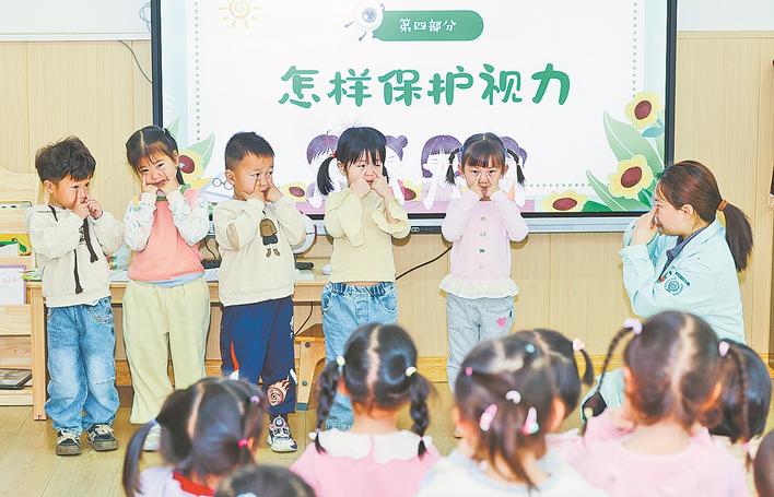 4月7日,在石家庄市华北幼儿园,小朋友在眼科医生的指导下学习眼保健操,科学保护眼睛。