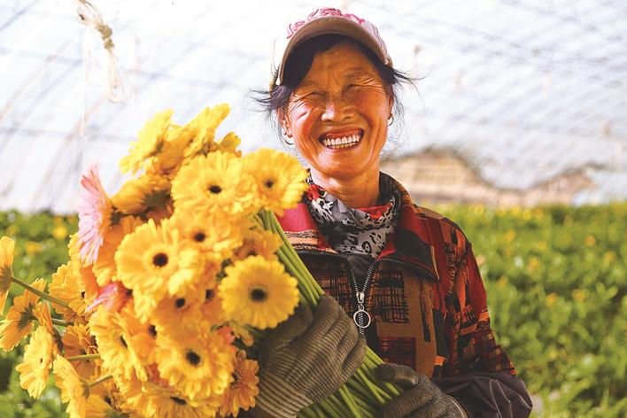 农民展示采摘下来的鲜花。
