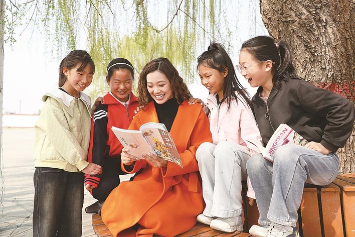 日前,在丰润区白官屯镇福庆寺小学,孩子们通过多种多样的活动享受阅读的乐趣,养成良好的阅读习惯。图为该小学教师带领学生在校园里快乐阅读。 朱大勇 摄