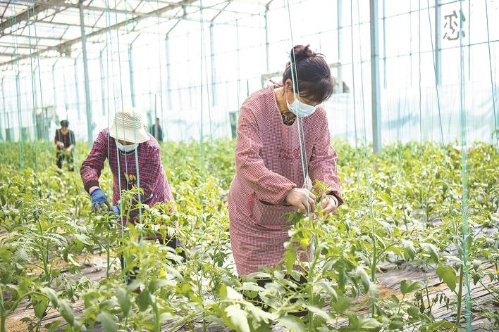 永清县彩木营村规划建设的柿柿红小镇,采取“龙头企业+村集体+基地+农户”的运行机制,以彩木营村为主导,辐射周边多个村街。目前,小镇标准化生产面积达5000亩,年产西红柿2.5万吨,产值达1.5亿元。图为该村农户在进行西红柿盘秧。韩信州 摄