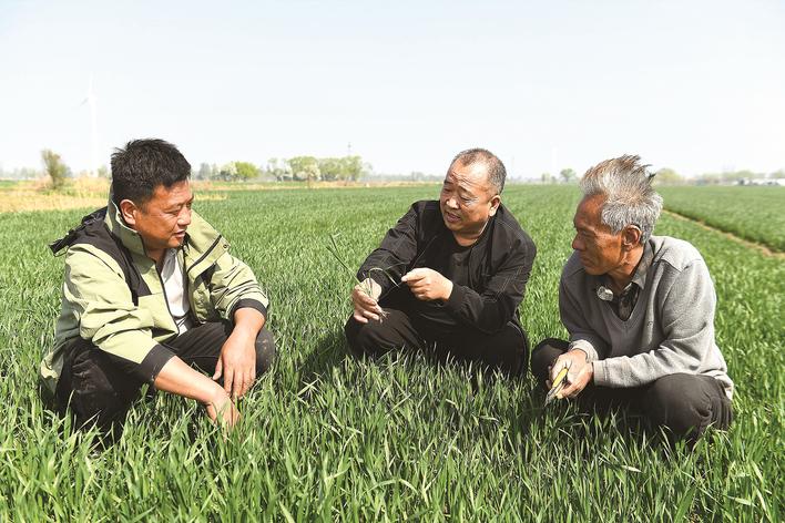 近年来,大城县积极组织农业技术专家加强小麦日常管理和现场培训指导,确保小麦品质和产量,确保粮食丰产、农民增收。图为在大城县广安镇西桑生村小麦种植基地,农技人员为农户讲解病虫害防治知识。刘亮 摄