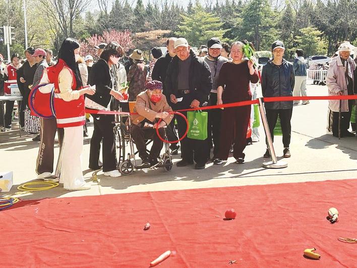 4月10日,保定市竞秀区阳光北社区联合竞秀区民政局、保定市社会组织促进会、竞秀区社会组织孵化基地举办“阳光助老暖春日,乐享运动筑友好”主题活动。图为老年人参与“趣味套瓜果”游戏。 姚素君 摄
