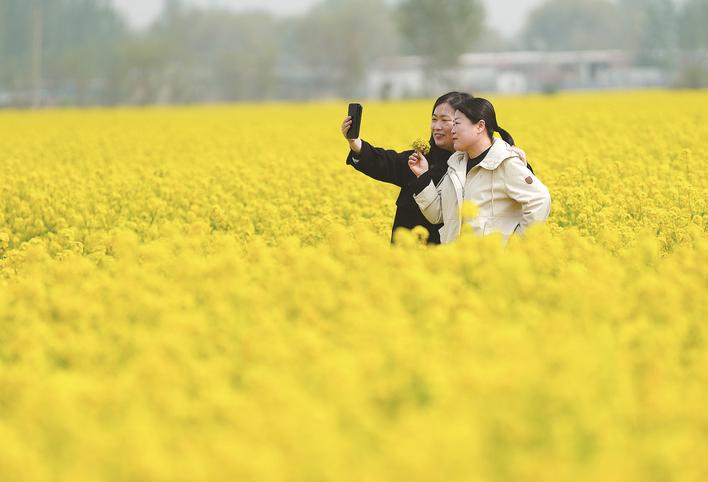 大城县因地制宜发展油菜种植,打造连片特色赏花基地,同时完善步道、停车、休憩等配套设施,不断提升乡村旅游品质,为乡村振兴注入强劲动力。图为日前在该县广安镇小广安村油菜花田,游客赏花游玩。刘亮 摄