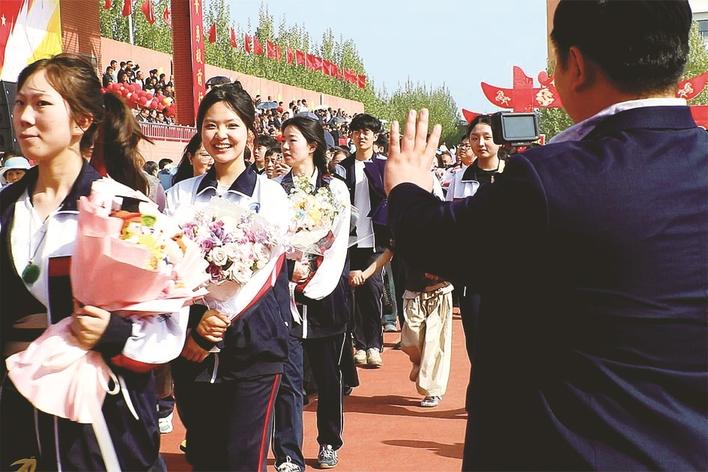 4月18日,以“少年自有凌云志 不负人间十八年”为主题的衡水武邑宏达东方学校第六届成人礼举行,全体高二学生迎来庄严的18岁“成人时刻”,开启崭新的人生历程。图为老师为学生留下精彩时刻。 记者 张千 摄